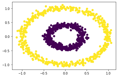 X, y = datasets.make_circles(n_samples=n, shuffle=True, noise=0.05, random_state=None, factor = 0.4)